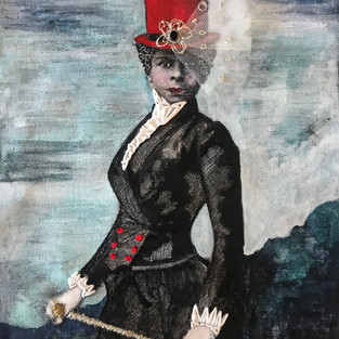 "On my return, I became obsessed with searching for vintage images of unknown or unrecognized women. It is a very organic process. I may initially choose the image for a certain reason but then as I work on it, it becomes something else completely. With the paint and stitches, the women come to life in a new way and a narrative between subject and viewer begins. Some of the pieces are humorous like “Waiting for Santa”, some political like ‘Votes for Women”’ and some highlight the beauty of diversity like ‘La Cubana’ and ‘Maori’ Like many artists working in this challenging time of Covid-19, the theme of the pandemic has crept into my work. ‘Mask I’ and ‘Mask II’ show vintage women in masks as they may have been during the Spanish Flu pandemic. As I work the series the pieces are transforming into more abstract, mystical works like ‘Minds Eye’. In this piece I experimented with dyeing and printing techniques on non-traditional materials that are then integrated into the painting with the stitching. I am working smaller than I usually do with this series as there is an intimacy that I feel with the subject matter. I feel connected to a long legacy of women who literally held families, homes, and businesses together by ‘threads'."