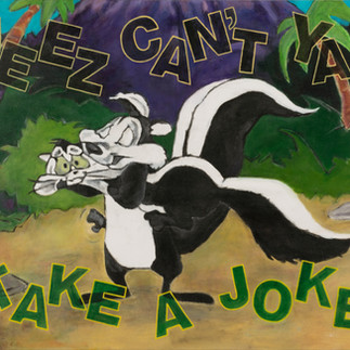 'Revenge of the Nerds', acrylic, glitter, sequins, spangles, acrylic marker, 30 x 48 inches., 'Pepe Le Pew' acrylic, acrylic marker on canvas, 30 x 36 inches.