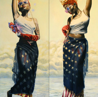 left to right: 'Lip Licking Liberty For All', oil and mixed Media on Dibond,36 x 24 inches., 'Madame President', oil and mixed media on Dibond, 24 x 24 inches., 'Firecracker', oil on Dibond, 18 x24 inches.
