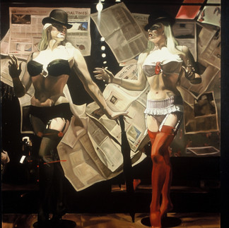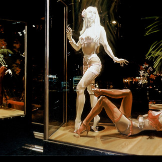 Not long after that visual experience, I took my easel out on the street and painted on small canvases from the several shop windows. Plein air painting at night is a challenge. I started out at dusk, when I could see clearly and painted a sketch of the image on canvas. I brought a small campers light. I set up and memorized my palette of warm/cool pigments so I knew where everything was placed before it got so dark, I would not be able to see my palette distinctly. In painting at night you cannot have too much light overhead, such as street lights, because the light will distort the colors on your palette. I was careful that I stepped several feet away from a street light so there was not an interference. I made many oil studies from the shop windows. The illuminated mannequin was my model. Eventually the small paintings turned into larger works. For me, I felt the image needed to be more dramatic. An icon should be large in scope.'