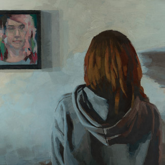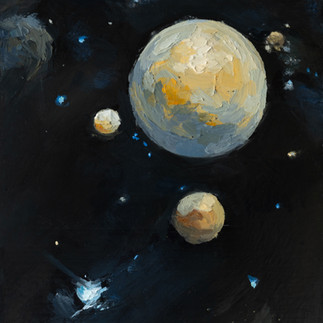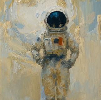 I've explored this journey by depicting astronauts in loosely painted oil and acrylic scenes on paper. Drawing inspiration from my love for science fiction, astrophysics, and the cosmos, I've imagined these figures as explorers, each navigating their own course toward self-definition. The hidden faces behind the dark visors of their helmets reflect my own uncertainty in the aftermath of profound loss.